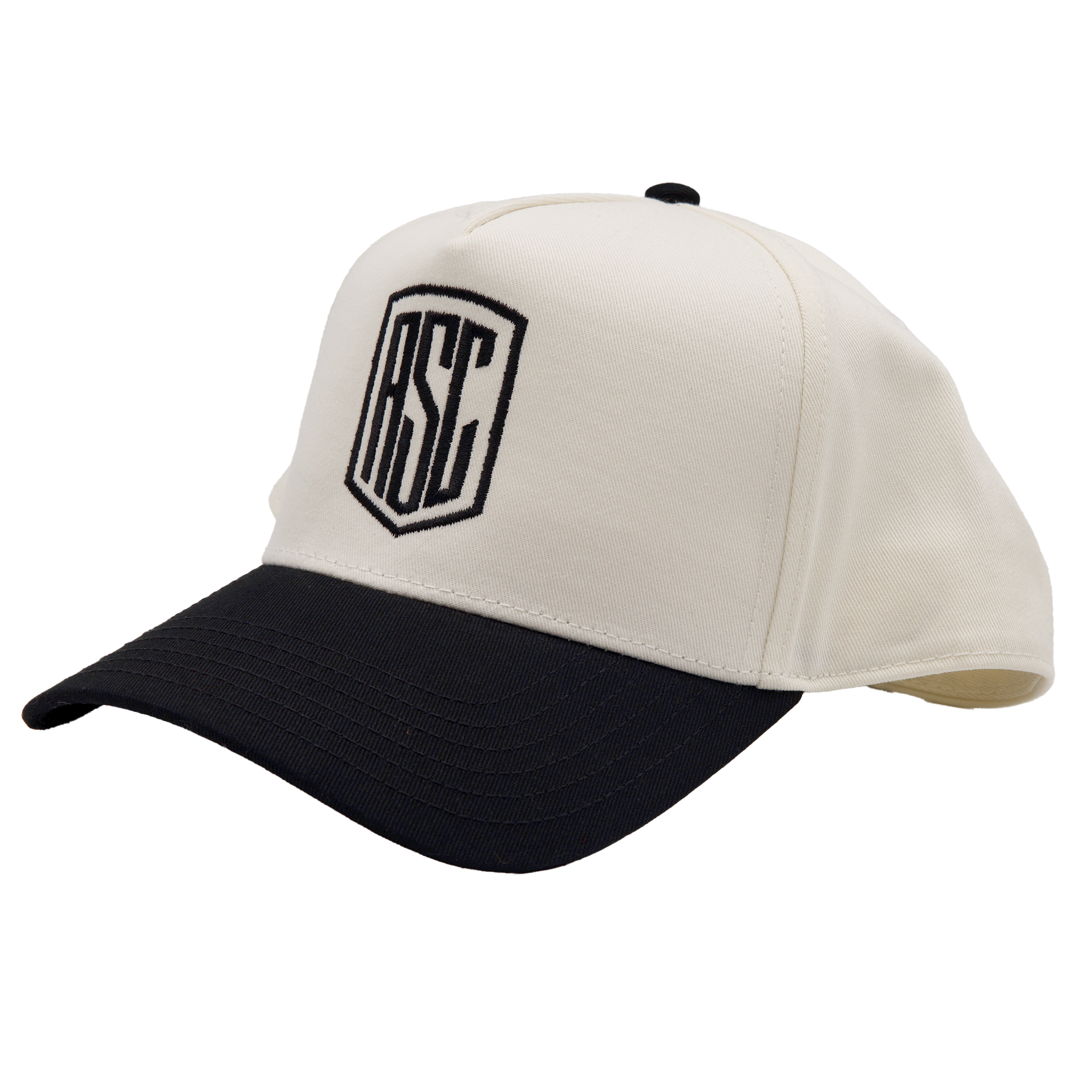 The Frame Two-Tone ASC Cap, featuring a high profile design made from mid-weight 100% cotton. It has a structured front, contrast dome, plastic snapback, curved peak, and tonal eyelets.