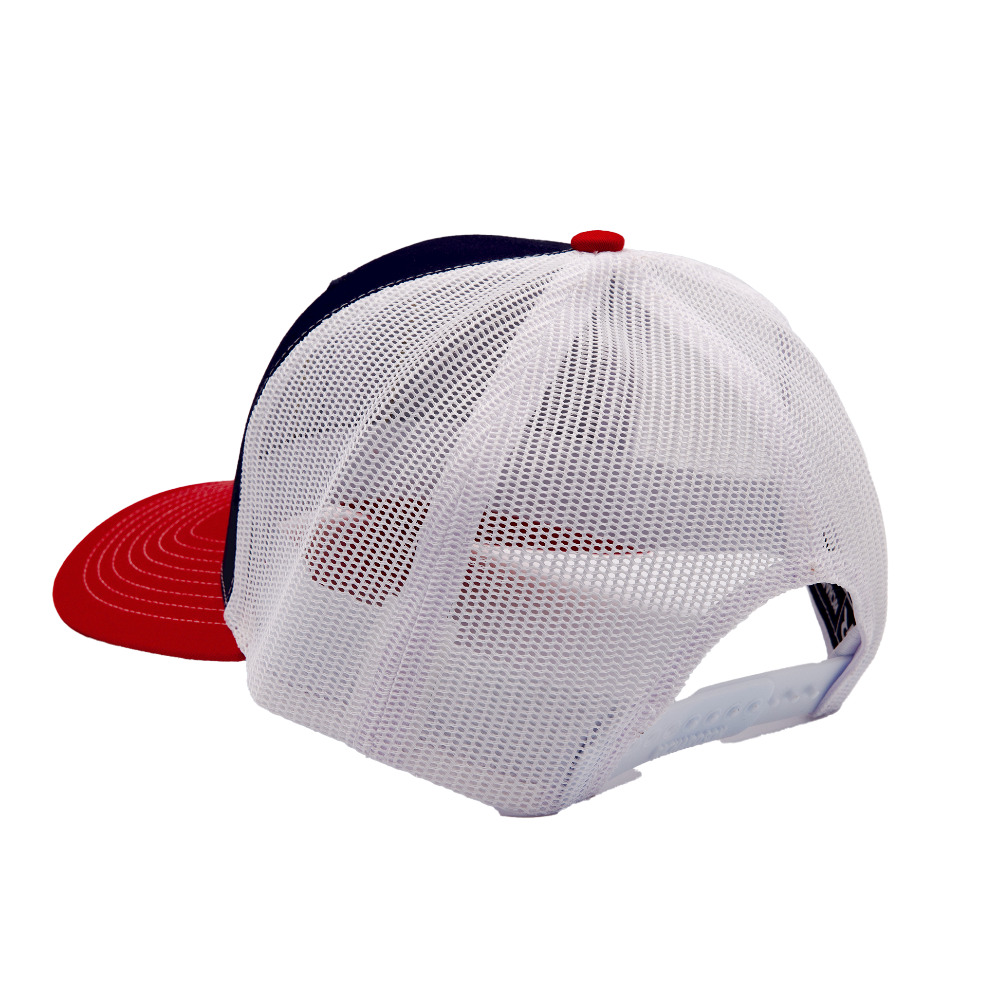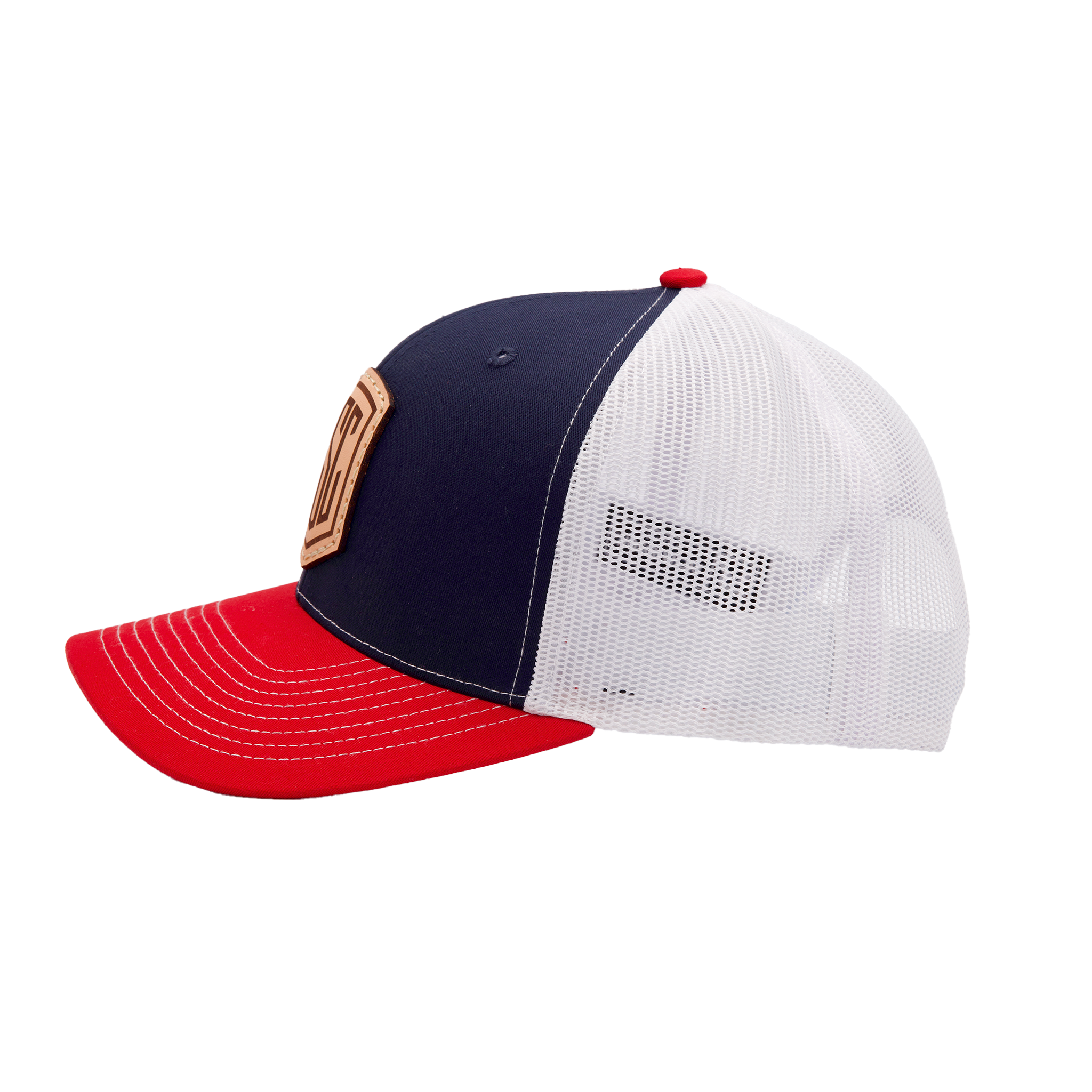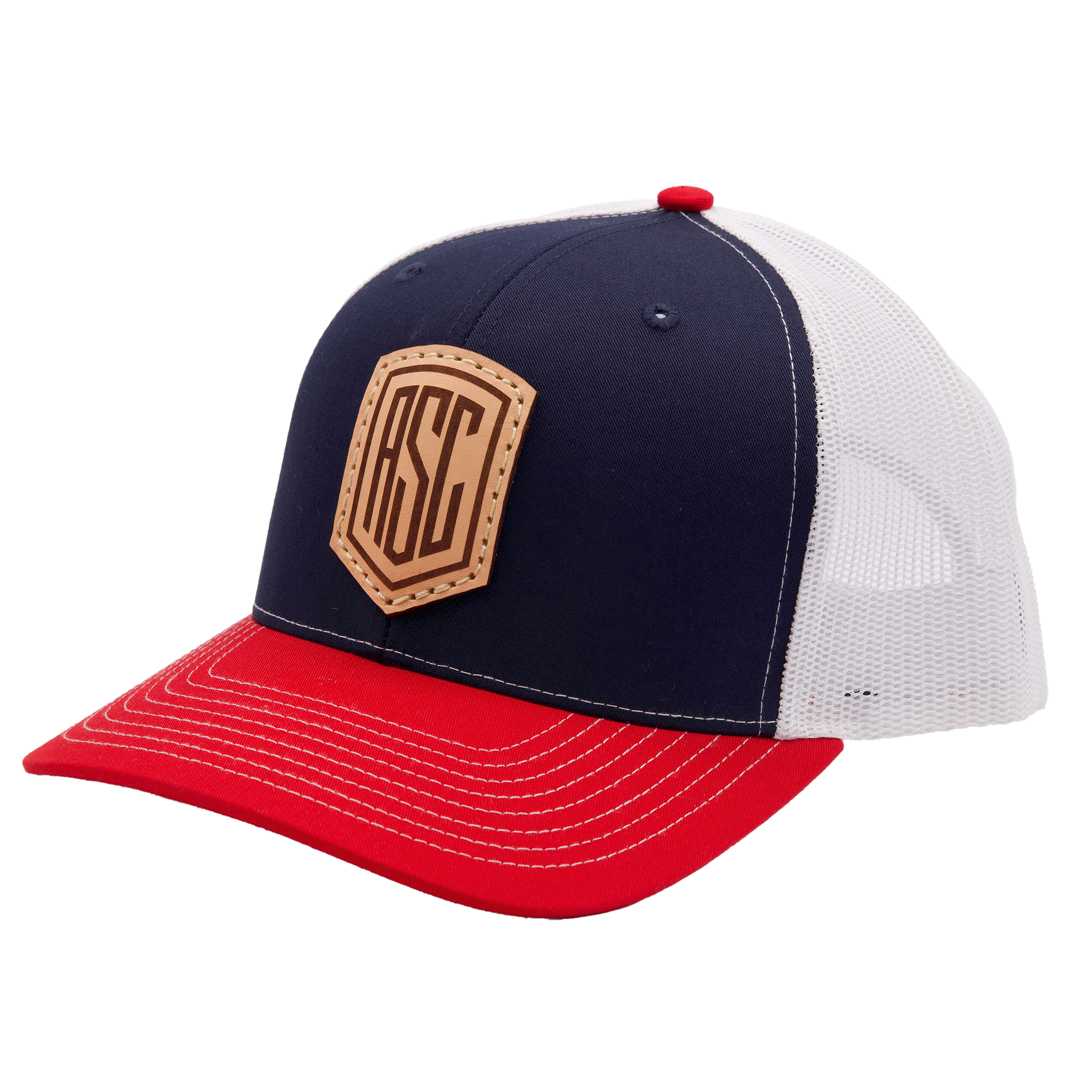 ASC Leather Patch Snapback Trucker Cap Tri-Color: Tri-Color: Navy/White/Red